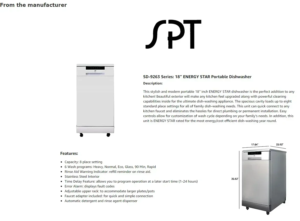 This stylish and modern portable 18″ inch energy star dishwasher is the perfect addition to any kitchen! Beautiful exterior will make any kitchen feel upgraded along with powerful cleaning capabilities inside for the ultimate dish-washing appliance The spacious cavity loads up to eight standard place settings for all of family dish-washing needs This unit can quick connect to any kitchen faucet and eliminates the hassles for direct plumbing or permanent installation Easy controls allow for customization of wash cycle depending on your family’ s needs In addition this unit is energy star rated for the most energy/cost efficient dish-washing year round Features and Functions · Capacity 8 place setting · 6 Wash programs Heavy Normal Eco Glass 90 Min Rapid · Rinse Aid Warning Indicator refill reminder on rinse aid · Stainless Steel Interior · Time Delay Feature allows you to program operation at a later start time (1-24 hours) · Error Alarm displays fault codes · Adjustable upper rack to accommodate larger plates/pots · Faucet adapter included for quick and simple connection · Automatic detergent and rinse agent dispenser · CSA – . US Certified · Energy Star For standard faucet head with a side/detached sprayer while attached to the faucet some detached sprayers will experience water leakage due to line pressure This is from the design of these faucets to redirect the water pressure from the main faucet head to the side sprayer If you have a side sprayer you will most likely need to install a water line that is separated from the sprayer Specifications Input voltage 120V / 60Hz / 9 18A Energy consumption 237kwh/yr Water consumption 2 6 – 5 gallons Power consumption 1000W Noise level (no