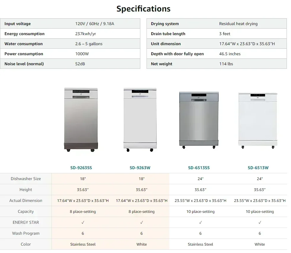 PMD4-SPT SD-9263W 18″Wide Portable Dishwasher with ENERGY STAR,6 Wash Programs,8 Place Settings and Stainless Steel Tub–White,