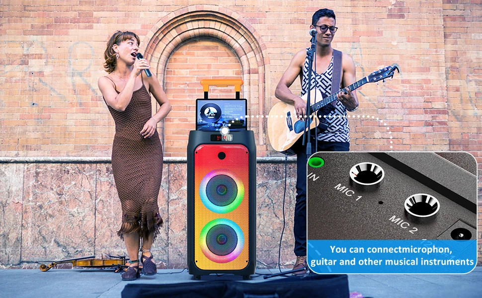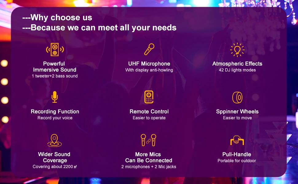 Two wireless UHF anti-whistling and no noise microphones (Enjoy a multi-person karaoke party without buying additional microphones) The wireless distance can be as far as 50M, breaking free from the bondage of wired.