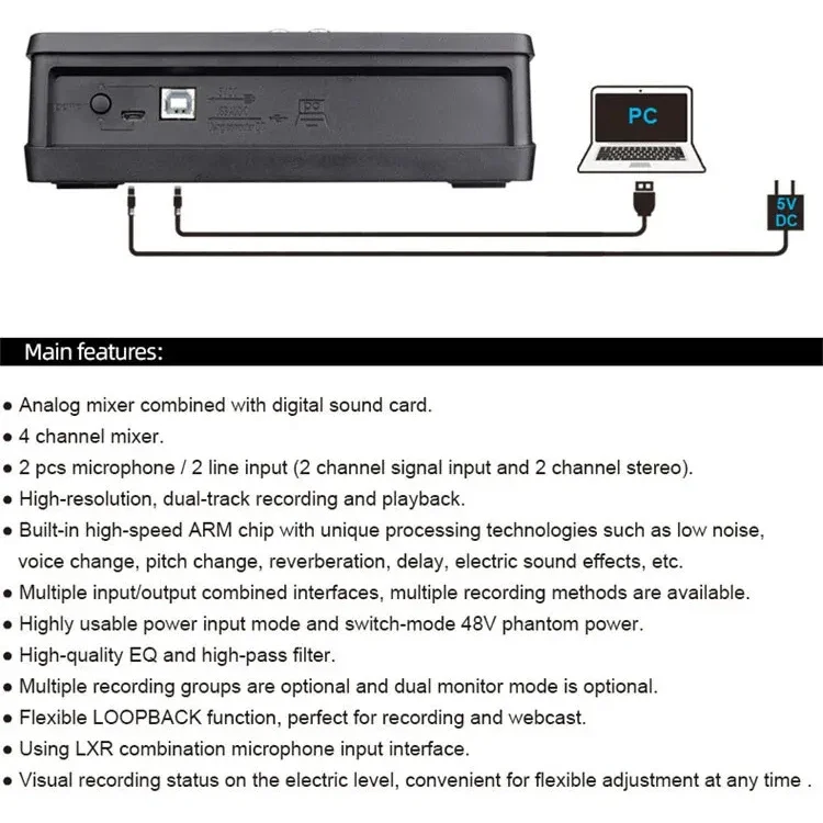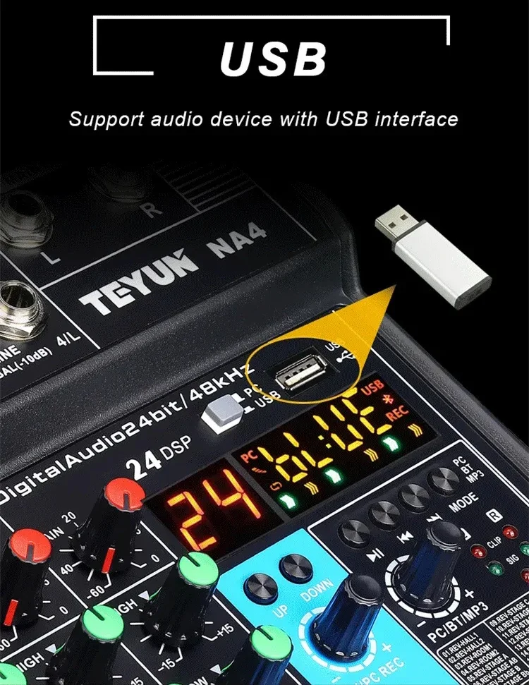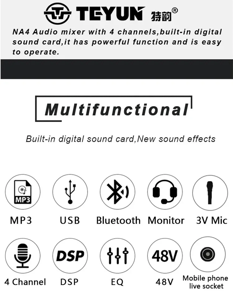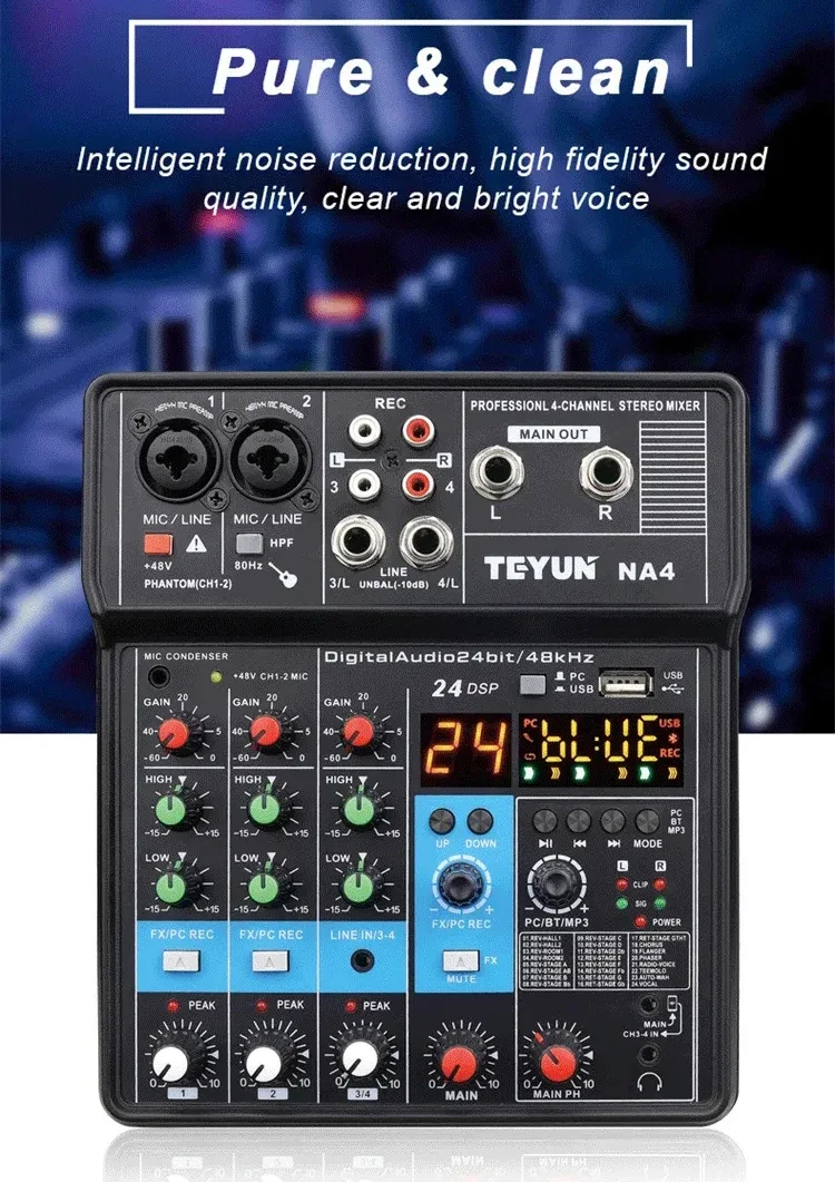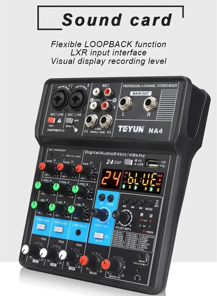 TEYUN 4-Channel Professional Sound Mixer Console Mini Audio Mixer Sound Card Computer Input 48v Power USB Computer Record NA4